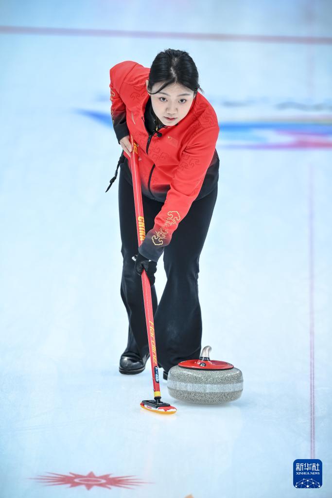 2月4日,中国队选手韩雨在比赛中掷壶。