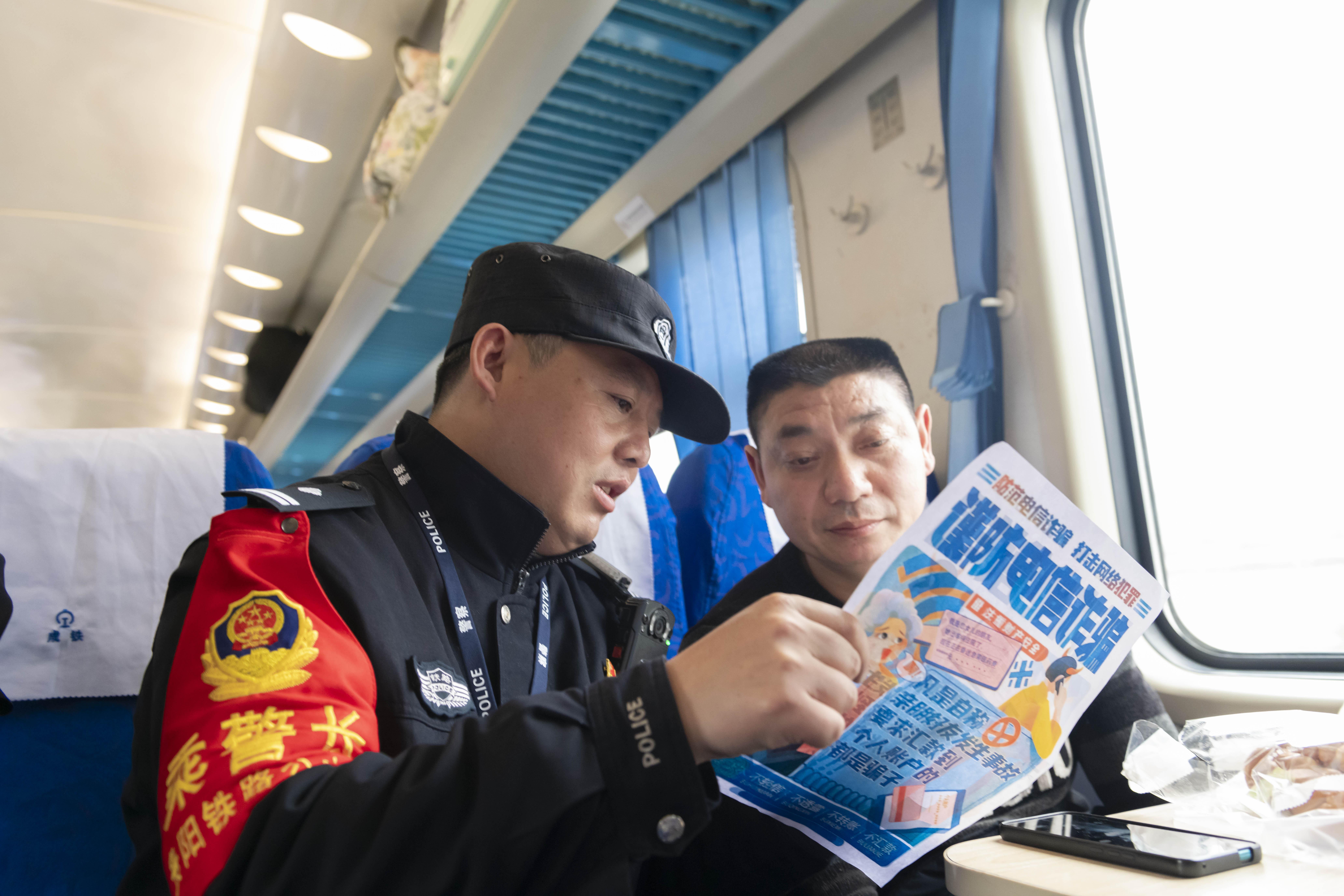 图为潘广杰(左)正在向旅客普及防范电信网络诈骗知识。(贵阳铁路公安处供图)