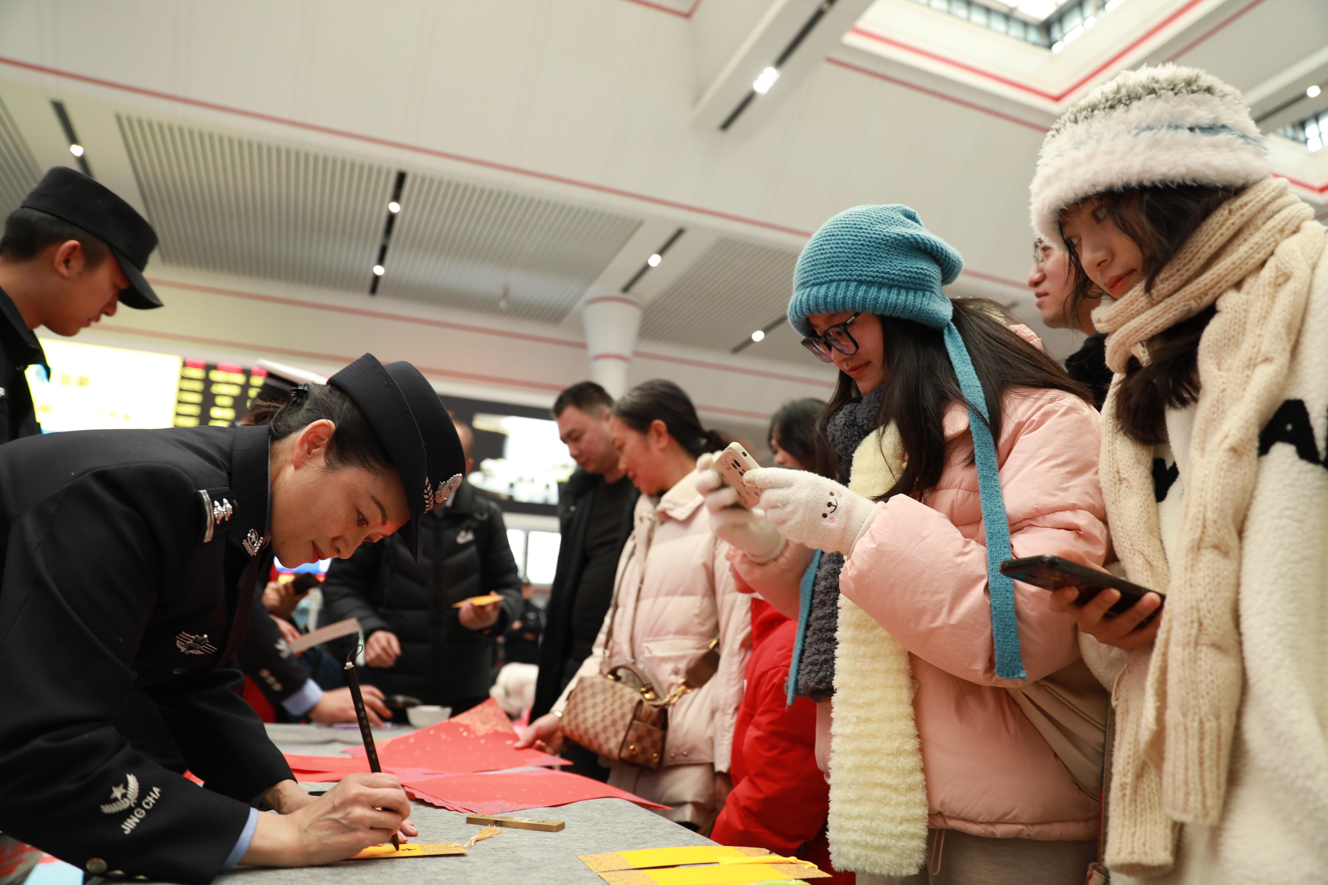 春运首日,贵阳北站内,年味正浓,数位铁路公安民警正挥毫泼墨,用毛笔在一张张四方红纸上写下“福”“喜”“平安”“喜乐”等代表新春祝福的大字。红纸黑字间,传递着铁路警方对乘客们的温暖关怀。一位领到“福”字的乘客笑着说:“没想到在车站还能收到这么特别的礼物,心里暖暖的。”
