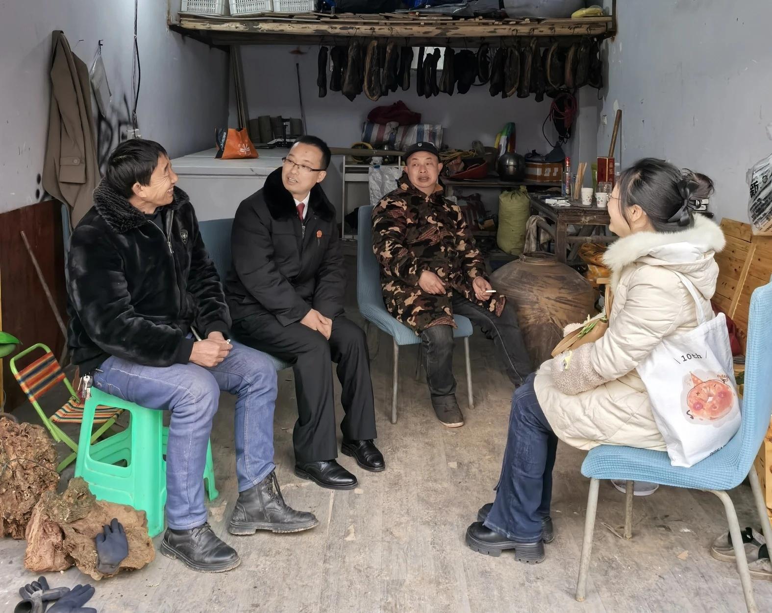 1月23日,屏山法院在开展欠薪专项执行行动中,办案法官(左二)前往申请执行人家中了解情况。