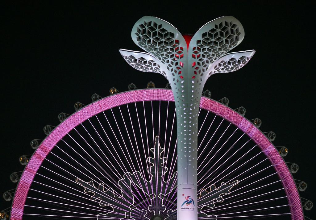 当喧嚣的赛场渐渐沉寂,当忙碌的身影停下脚步,开幕式上的巨型冰灯返场,镜头来到分会场。夜空之下,冰雪大世界里,雪花摩天轮前,亚冬圣火缓缓熄灭,绚丽灯光灼灼其华。
