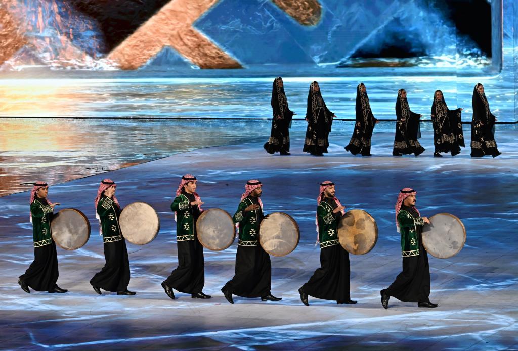 作为下一届亚冬会举办城市,来自沙特阿拉伯未来新城的文艺表演舞姿曼妙,鼓点欢快,洋溢着浓郁的西亚风情。顷刻间,整个舞台化作冰雪运动场,光影穿梭的运动员号召着下一次相约,在现场掀起新的高潮。