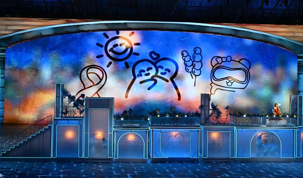 舞台上,当现场舞者与虚拟乐团交相呼应,闭幕式演出震撼开场。身穿橘黄纱裙的舞者翩然,宛如冰凌花朵朵绽放。可爱的“雪人”舞动全场,仿佛雪山的精灵带来捷报。