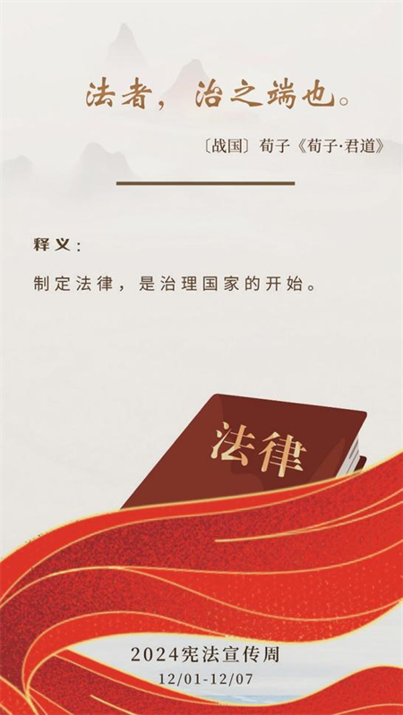 在2024年国家宪法日,光明网围绕“尊宪崇法”主题,开设网络专题,推出动漫、海报普法产品,以多形态网络宣传形式和手段,推出特色普法宣传作品。作品《尊宪崇法|“宪”在24小时》以MG动画的形式,将一家人的生活划分为几个场景,以展示宪法与每个人的生活息息相关,24小时都在维护我们的权益。海报《关于宪法与法治,典籍里这样说》,聚焦中国传统典籍中有关宪法和法治的名家名言,传递依法治国的法治思想。