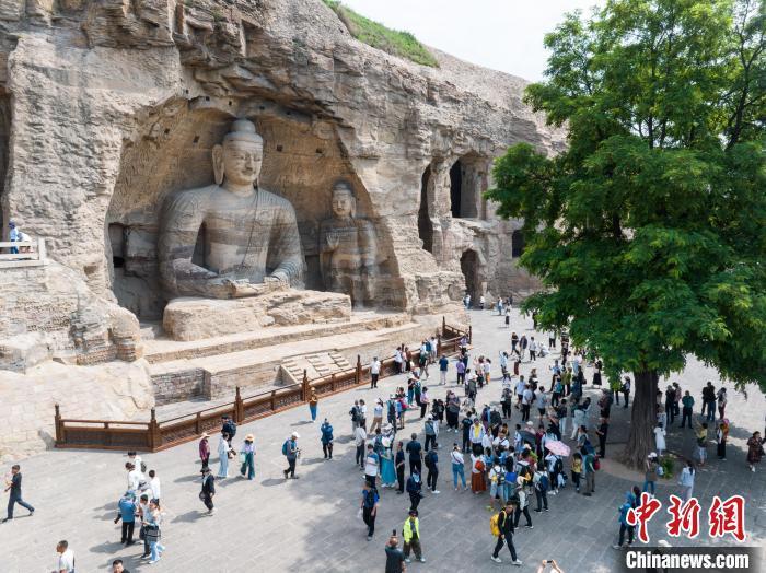 2024年7月3日,山西大同,游客在云冈石窟第20窟前参观。(资料图,无人机照片) 中新社记者 武俊杰 摄