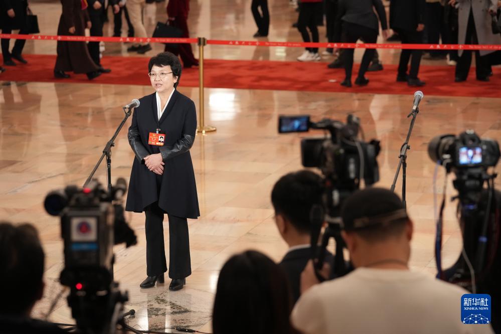 3月4日,全国政协十四届三次会议首场“委员通道”集体采访活动在北京人民大会堂举行。这是全国政协委员周岚接受媒体采访。