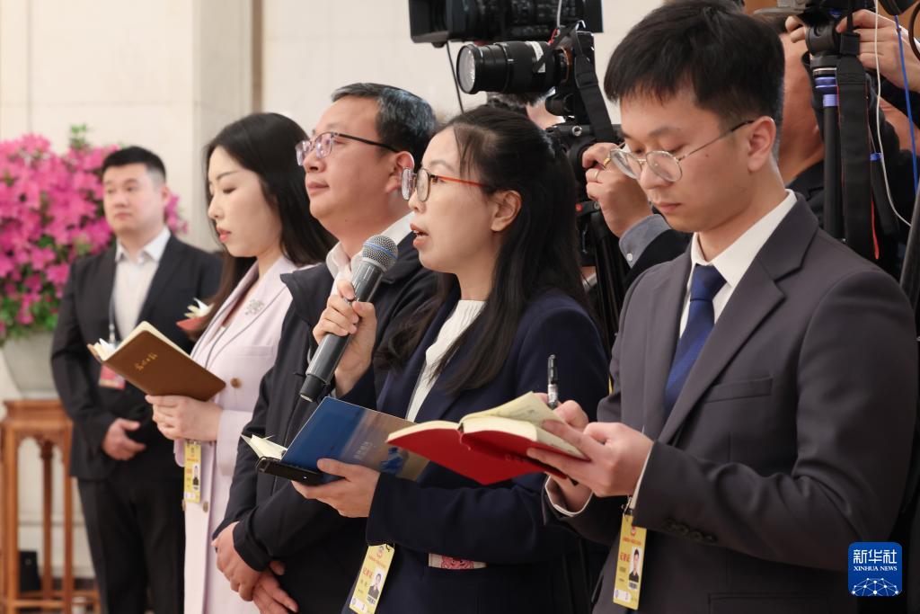 3月4日,全国政协十四届三次会议首场“委员通道”集体采访活动在北京人民大会堂举行。这是新华社记者在提问。