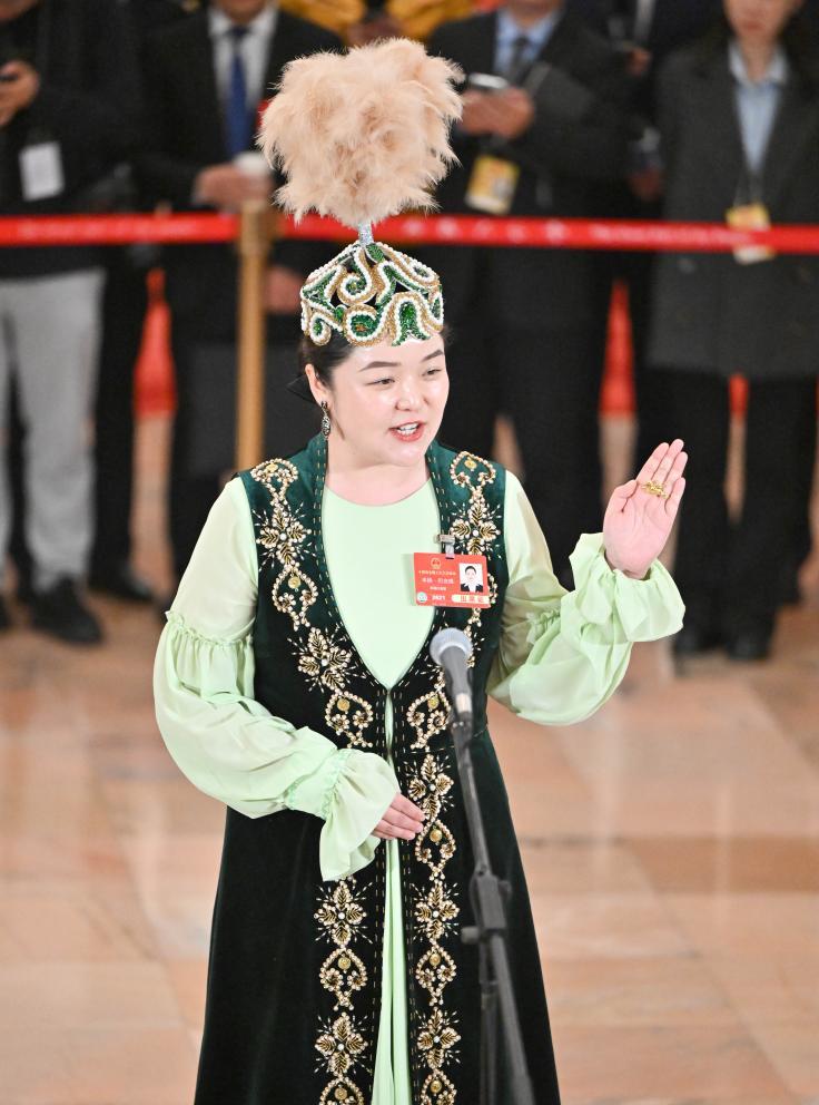 3月11日,第十四届全国人民代表大会第三次会议第三场“代表通道”集中采访活动在北京人民大会堂举行。这是全国人大代表卓娅·巴合提接受媒体采访。