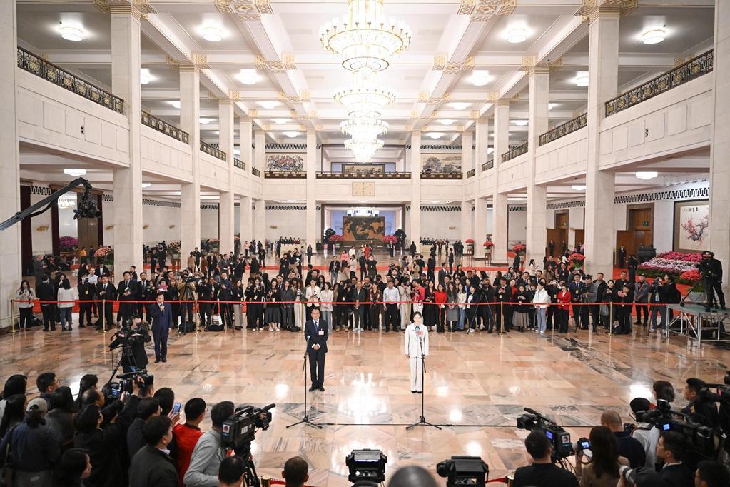 3月11日,第十四届全国人民代表大会第三次会议第三场“代表通道”集中采访活动在北京人民大会堂举行。这是记者在现场采访。