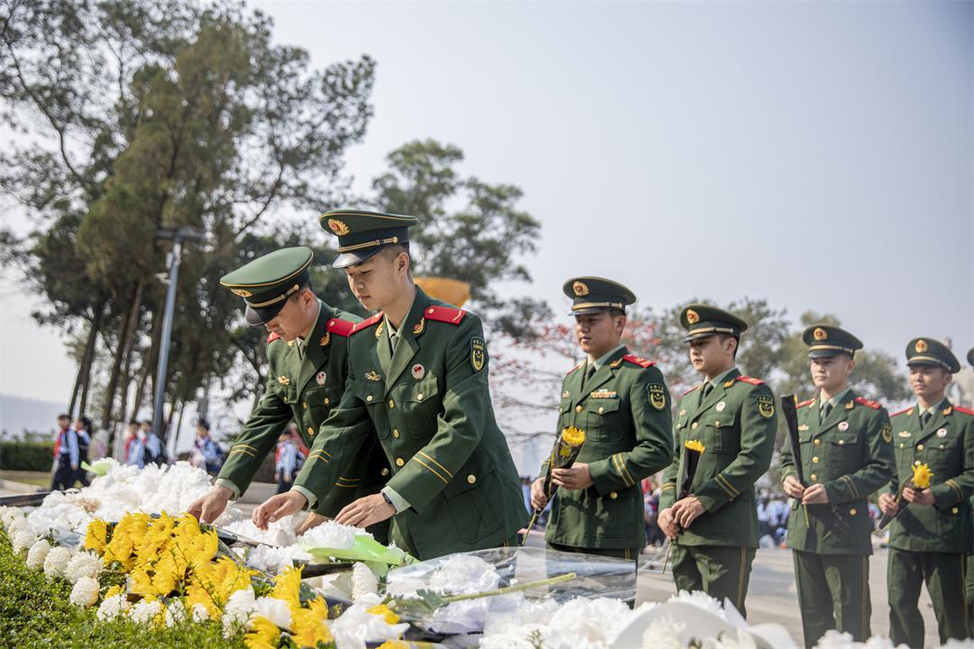 武警百色支队组织官兵开展缅怀革命先烈活动。图为官兵们依次向革命烈士敬献鲜花。 本报通讯员 温博 摄