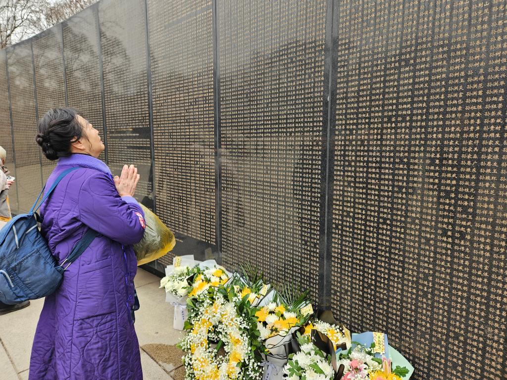 图为孙世安烈士的家属在沈阳抗美援朝烈士陵园烈士英名墙前祭拜。新华社记者 于也童 摄