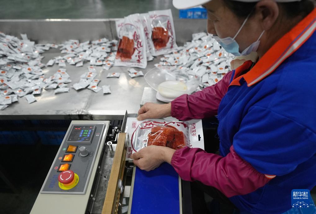 4月11日,工作人员在沈阳市阳阳食品有限公司封装辣条。