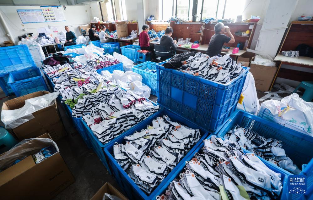 4月10日,在诸暨市缘锦针织有限公司的流水线上,工人在打包出口国外市场的袜子。