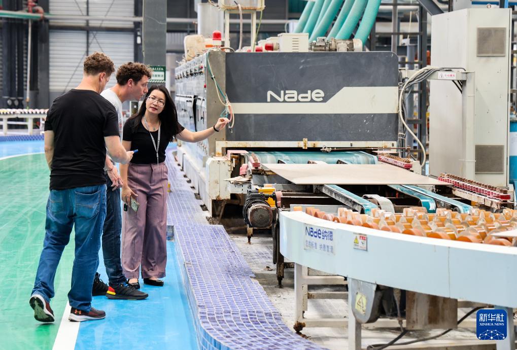 4月22日,两名参加广交会的阿根廷采购商专程来到佛山参观蒙娜丽莎大尺寸陶瓷岩板自动生产线。