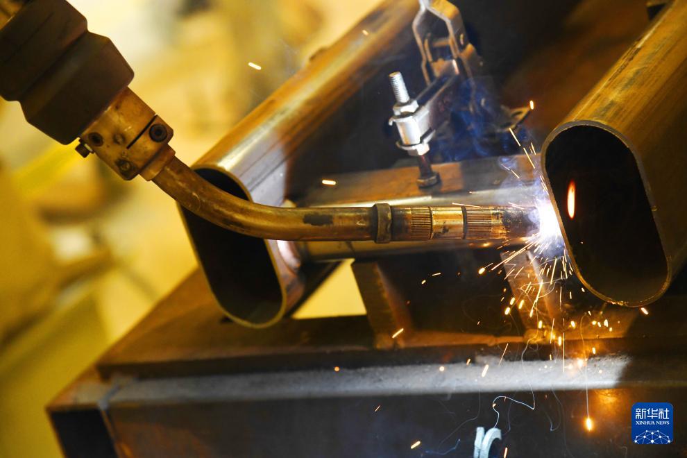 青岛英派斯健康科技股份有限公司智慧工厂内的自动激光焊接机器人在作业(4月22日摄)。
