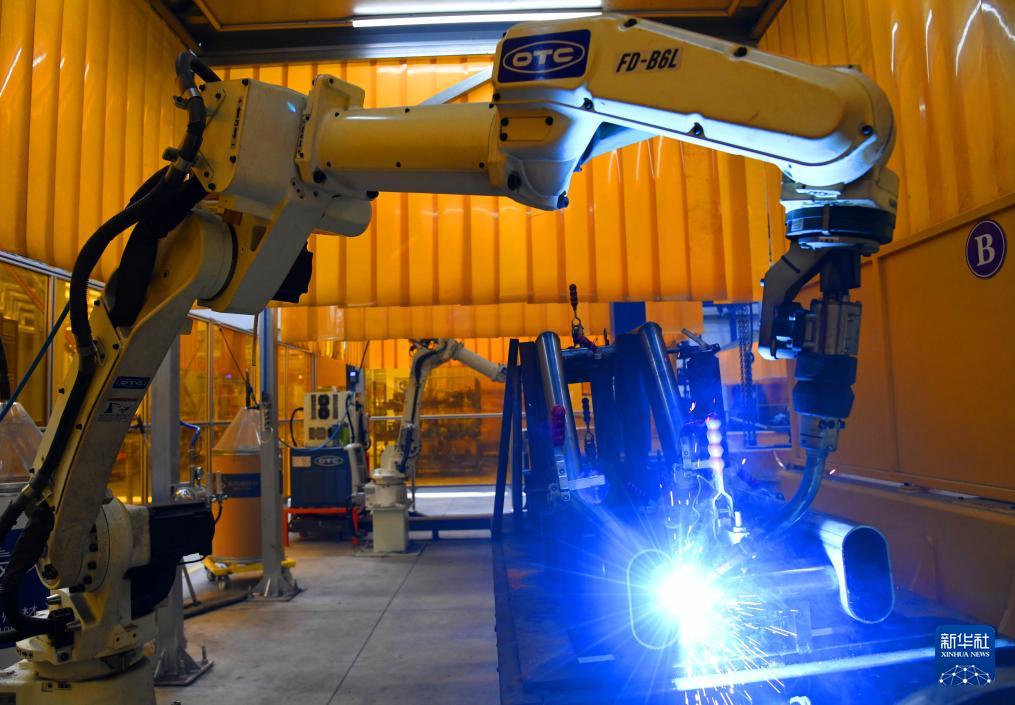 青岛英派斯健康科技股份有限公司智慧工厂内的自动激光焊接机器人在作业(4月22日摄)。