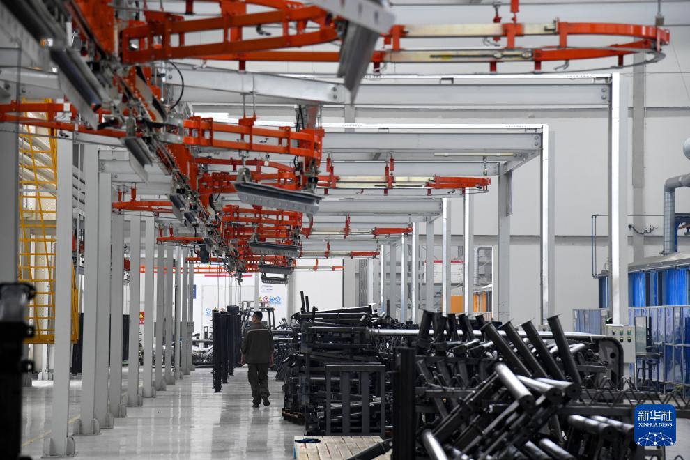 遍布青岛英派斯健康科技股份有限公司智慧工厂内的自动传输设备(4月22日摄)。