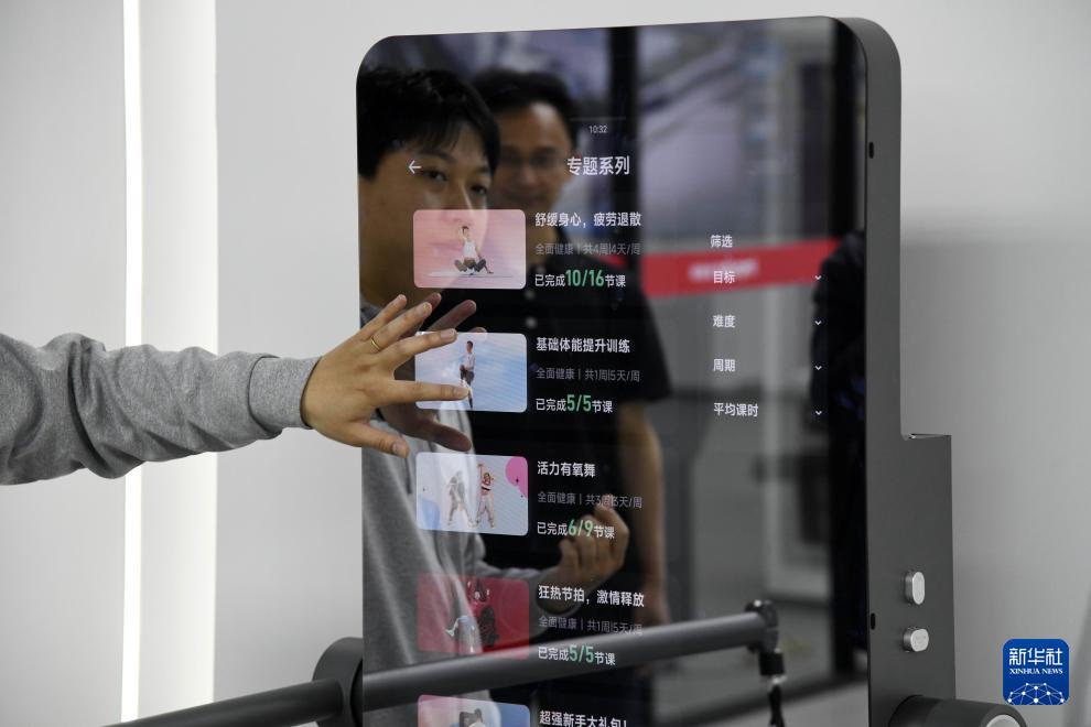 4月22日,工作人员在介绍英派斯智能健身镜的视频课程。