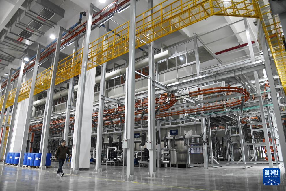 青岛英派斯健康科技股份有限公司智慧工厂内的自动喷涂生产线(4月22日摄)。