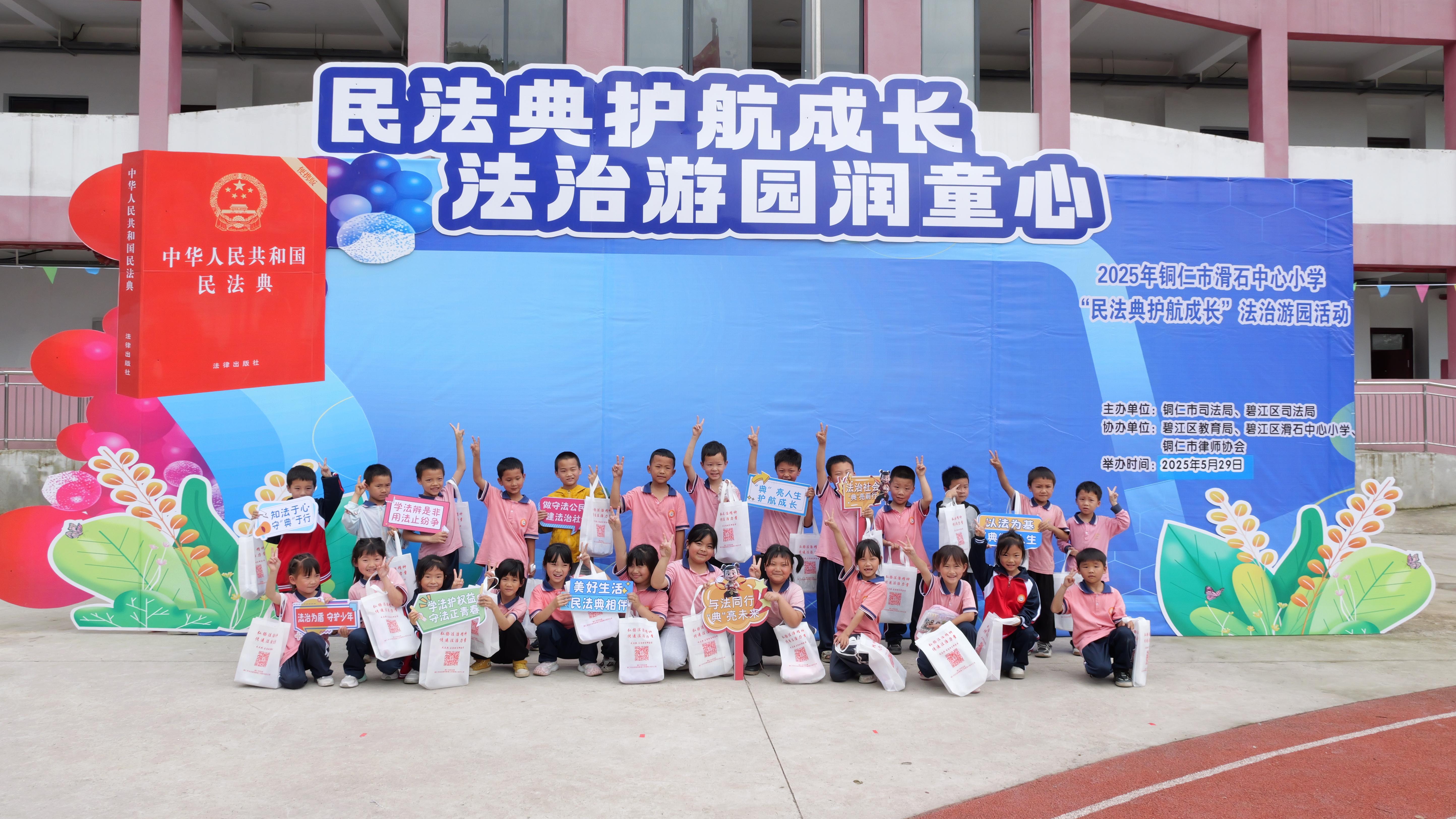 为增强未成年人法治意识与自我保护能力,让民法典走到未成年人身边、走进未成年人心里,贵州省铜仁市司法局携手碧江区司法局、碧江区教育局、铜仁市律师协会等部门在铜仁市滑石小学联合举办了一场民法典法治游园活动,为孩子们送上了一份特别的“六一”法治礼物。