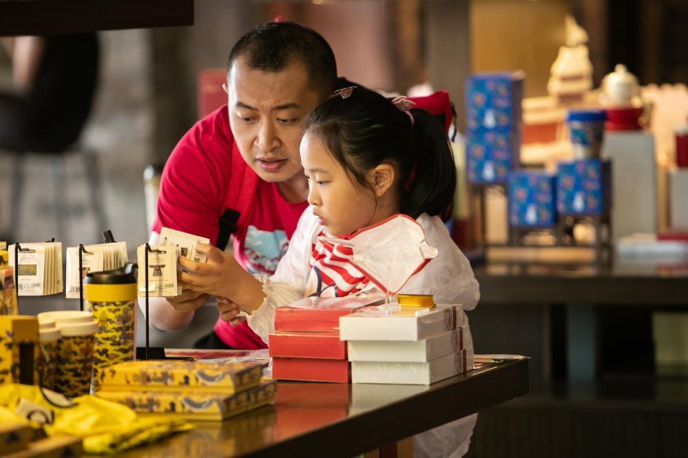 在重庆故宫文物南迁纪念馆的角楼咖啡店,顾客在选购文创产品。新华社记者 储加音 摄