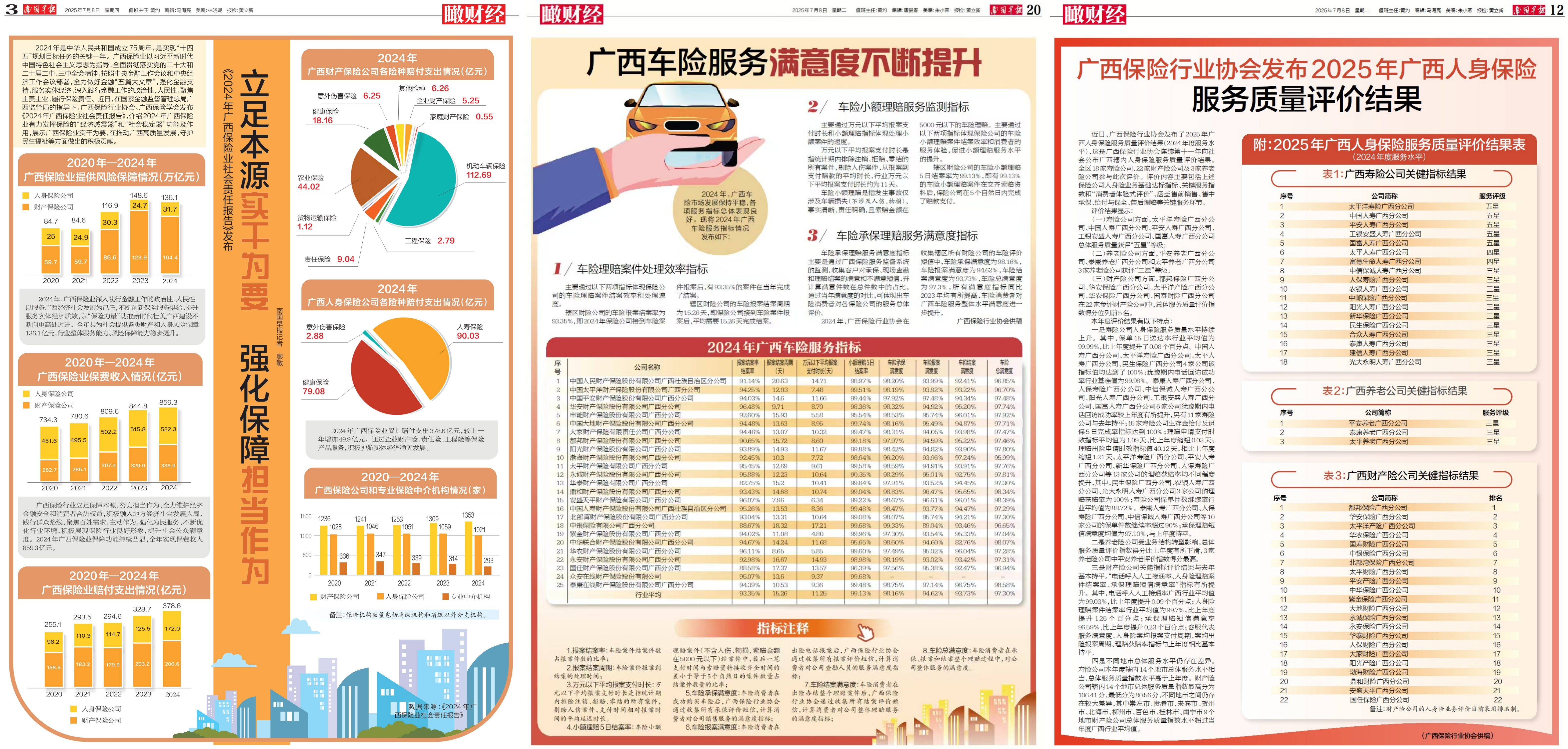 三是在广西主流媒体《南国早报》,用3个整版分别刊登《2024年广西保险业社会责任报告》《广西保险行业协会发布2024年广西人身保险服务质量评价结果》和《2024年广西车险服务指标情况》稿件,通过晾晒会员单位服务质量,促进会员单位提质增效。