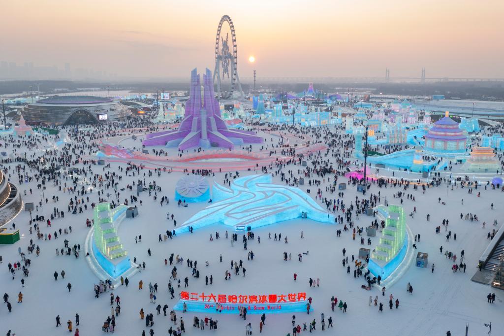 游客在哈尔滨冰雪大世界园区内游玩(无人机照片)。新华社记者谢剑飞 摄