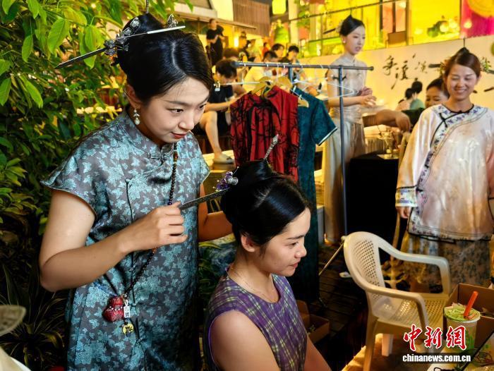 8月23日晚,在福州烟台山历史风貌区的三条簪体验现场,工作人员正在给一位女孩边梳妆边讲解头饰背后的文化寓意。 中新网记者 闫旭 摄