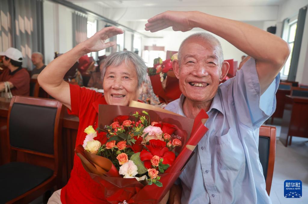 8月29日,在山东省临沂市兰山区银雀山街道银城社区,一对金婚夫妇在社区庆七夕活动中秀恩爱。