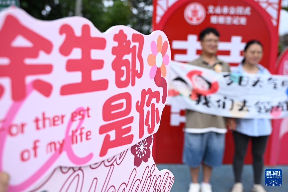 8月29日,一对新人在云南省文山市集体婚礼现场留影。