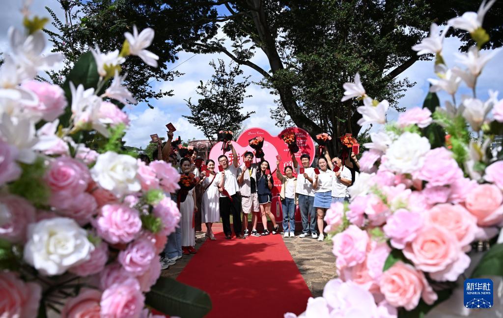 8月29日,在云南省文山市七花广场,新人们在集体婚礼上留影。