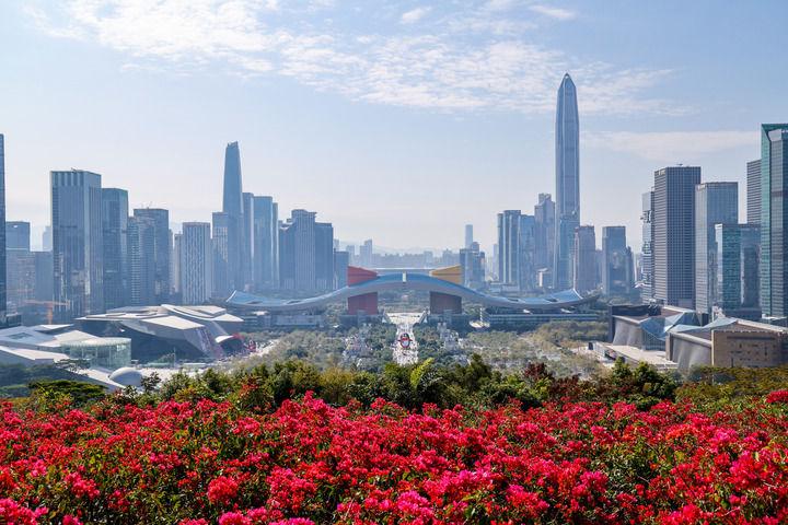 从深圳莲花山山顶俯瞰城市中轴线(2025年1月29日摄)。新华社记者 梁旭 摄