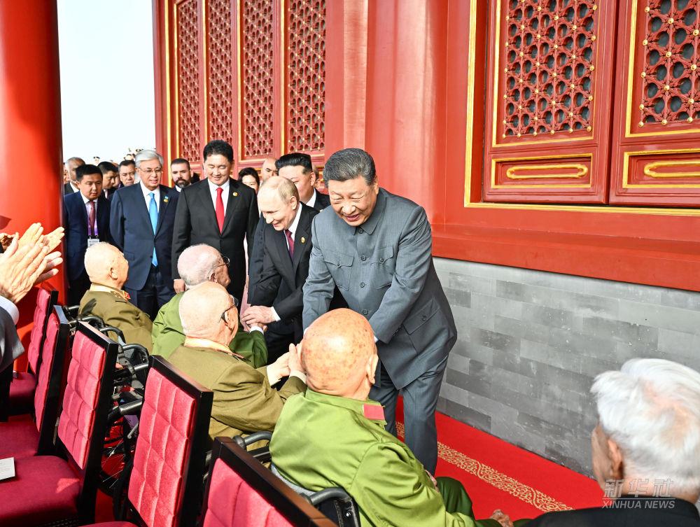 9月3日上午,习近平等登上天安门城楼。习近平同抗战老战士老同志代表亲切握手,向他们表示崇高敬意。