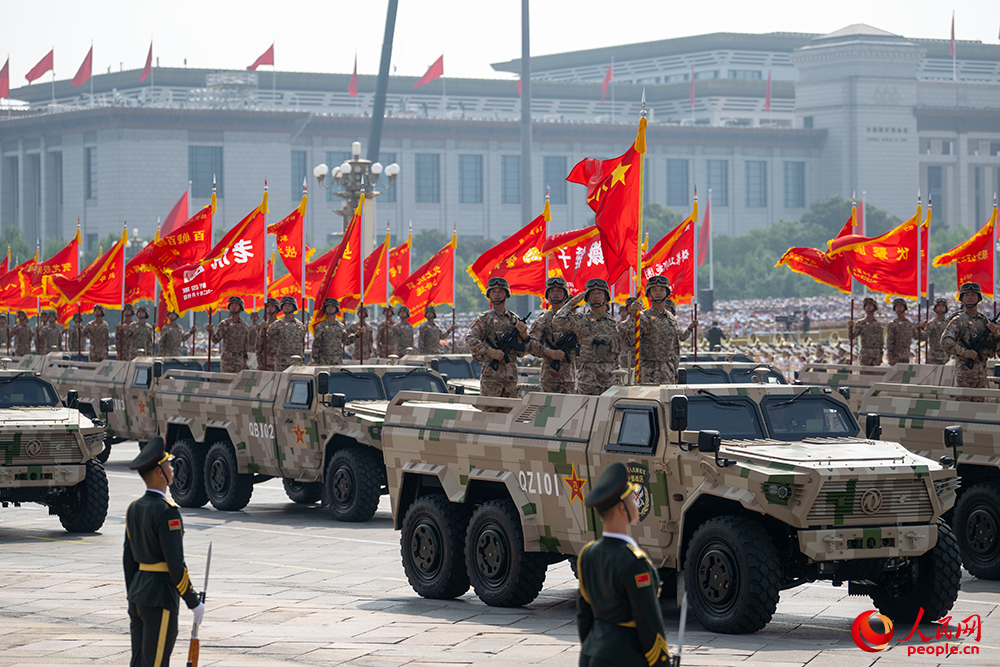 战旗猎猎,铁流滚滚。由80面抗战英模部队荣誉旗帜组成的战旗方队接受检阅。