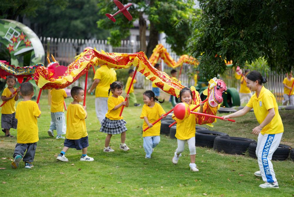 9月5日,四川泸州白酒产业园区天骄托育园的老师带领孩子们舞龙。新华社记者 江宏景 摄