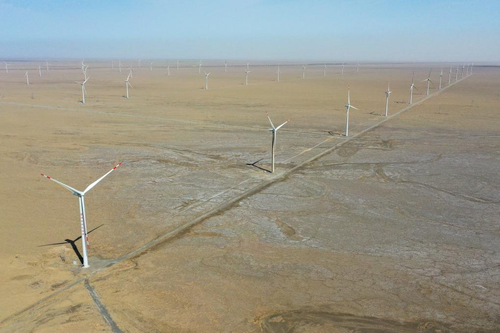这是在新疆巴音郭楞蒙古自治州若羌县拍摄的新天绿色能源股份有限公司新天若羌县罗布庄10万千瓦风电项目(6月27日摄,无人机照片)。新华社记者 丁磊 摄