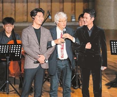 电影《狼图腾》导演让-雅克·阿诺(前排左二)与中国演员冯绍峰(前排右一)、窦骁在“光影百年·中法同行”电影音乐会上互动。 新华社记者 谢晗摄