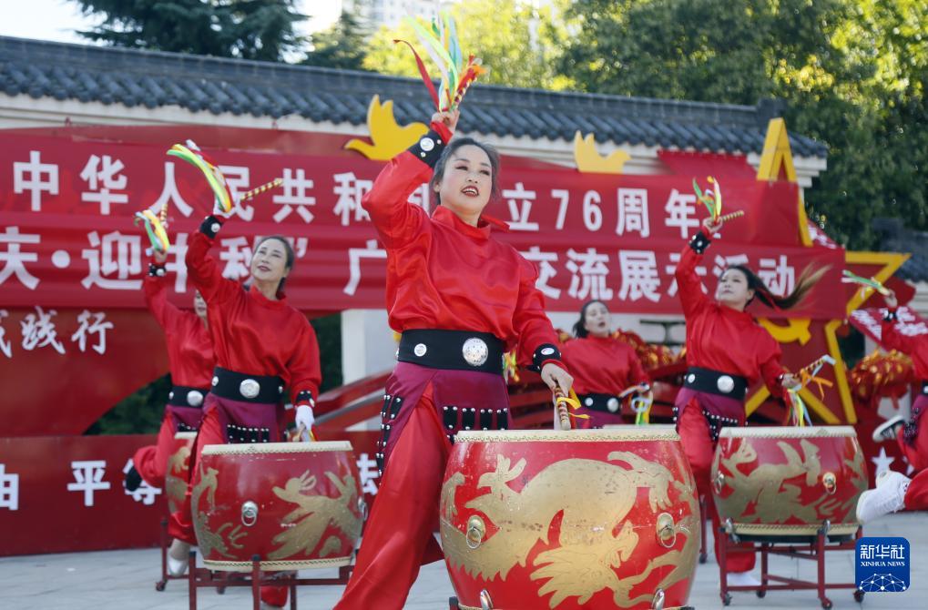 9月25日,在河南省洛阳市汝阳县刘伶广场,汝阳县牡丹艺术团在表演音乐鼓《中华魂》。