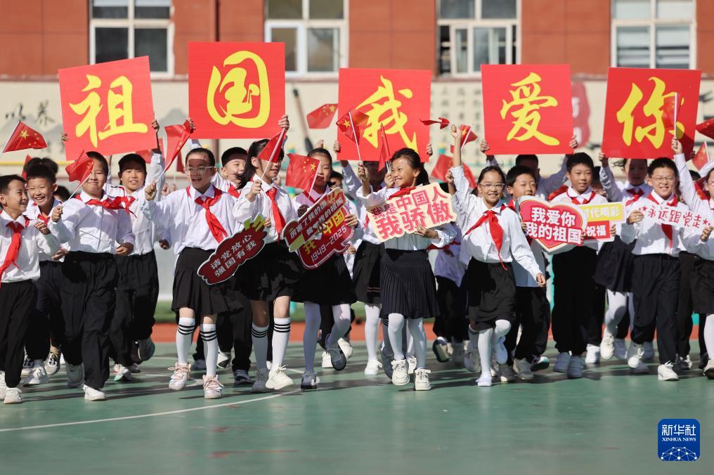 9月25日,在山东省临沂市沂南县,第三实验小学的小学生们参加“祝福祖国”活动。