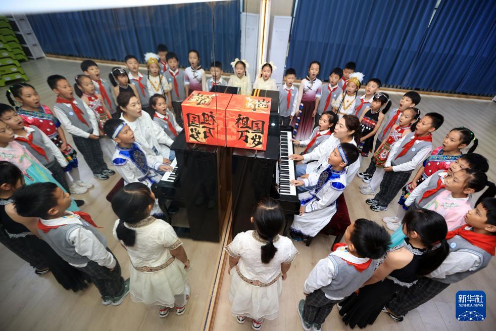 9月25日,在湖北省武汉市,未来实验小学师生演奏《我爱你中国》,迎接国庆节。