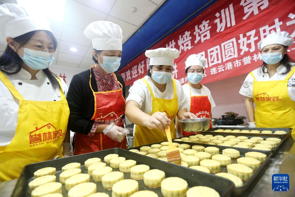 9月25日,在江苏省连云港市誉林家政培训机构,连云区墟沟街道南巷社区居民学习制作月饼。