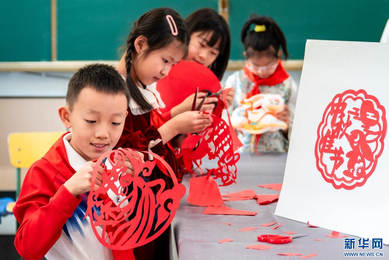 9月28日,呼和浩特市玉泉区清泉街小学学生在中秋节主题活动上制作剪纸作品。新华网发(丁根厚 摄)