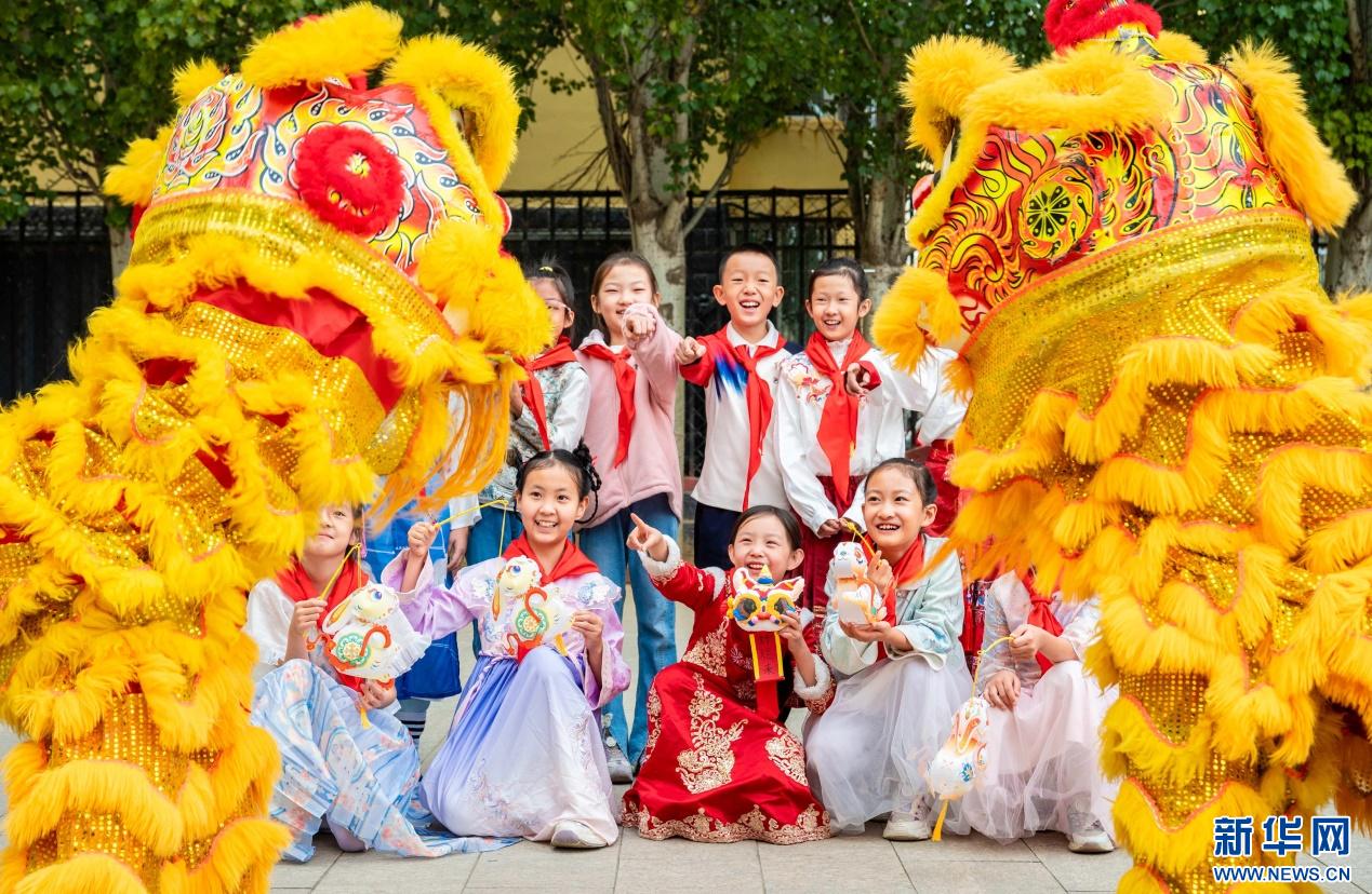 9月28日,呼和浩特市玉泉区清泉街小学表演舞狮的学生在中秋节主题活动上和同学们互动。新华网发(丁根厚 摄)
