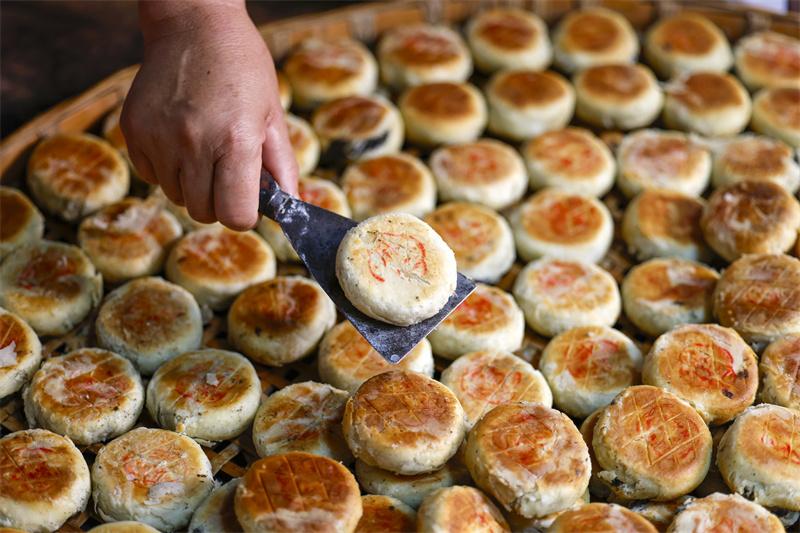 制饼师傅在摊放“徽式麻仁月饼”。新华网发(施亚磊 摄)