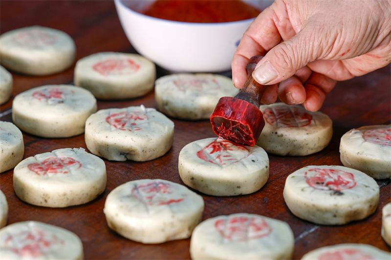 制饼师傅在“徽式麻仁月饼”上盖印。新华网发(施亚磊 摄)