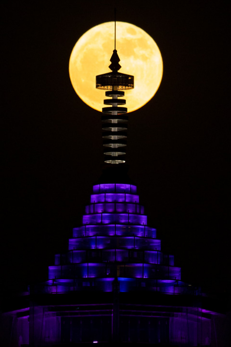 2022年6月14日,江苏南京大报恩塔与“超级月亮”相映成景。新华社发(苏阳 摄)