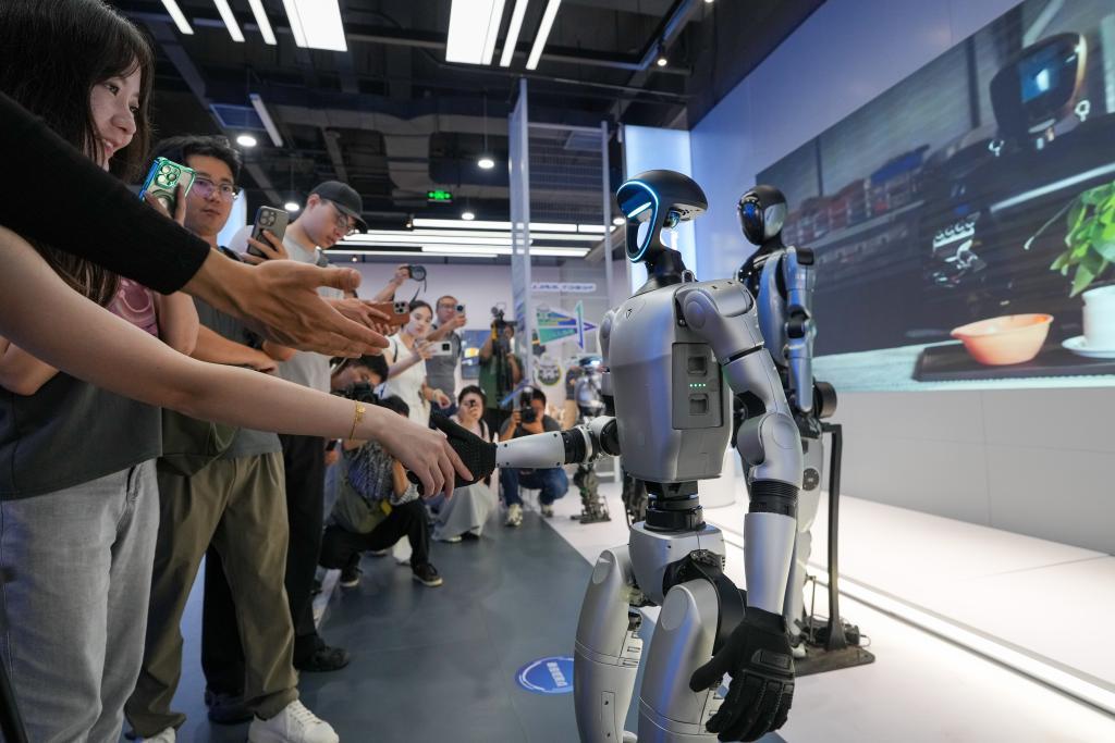 在位于北京经开区的全球首个具身智能机器人4S店(ROBOT MALL)内,观众在与一款人形机器人握手(2025年8月6日摄)。新华社记者 鞠焕宗 摄