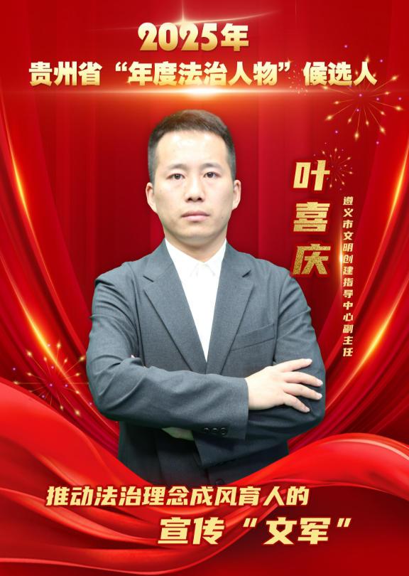叶喜庆,现任贵州省遵义市文明创建指导中心副主任。2023年以来,他立足本职、守正创新,将法治理念、法治思维与法治方式融入精神文明建设各方面,以实际行动助推法治政府和文明遵义建设再上新台阶。