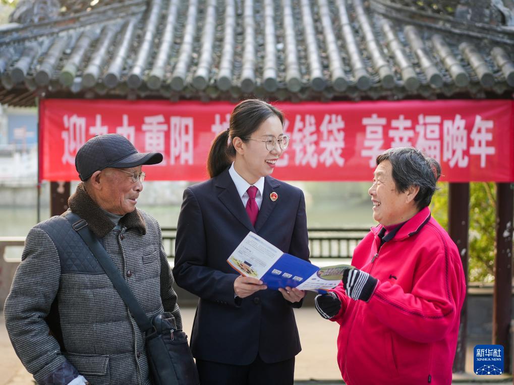 10月27日,江苏省兴化市人民检察院法治宣讲团的工作人员在公园为老年人讲解有关养老法律知识。