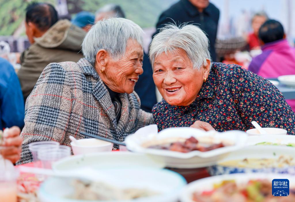 10月26日,江苏省泰州市姜堰区白米镇马沟村第三届重阳节“百寿宴”现场,两名老人在席间交流。